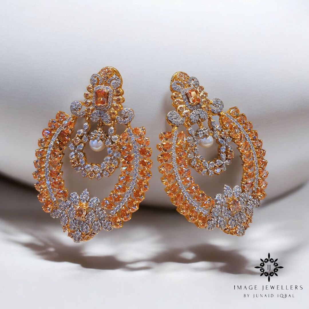 ✨ Elevate your look with this next-level elegance ✨ These 22kt gold-plated 92.5 pure silver earrings are the definition of statement jewelry. Featuring a square champagne stone, a big white pearl drop, and intricate detailing with diamonds and champagne stones, they’re pure fire. 🔥