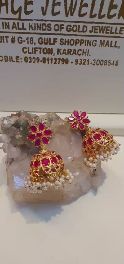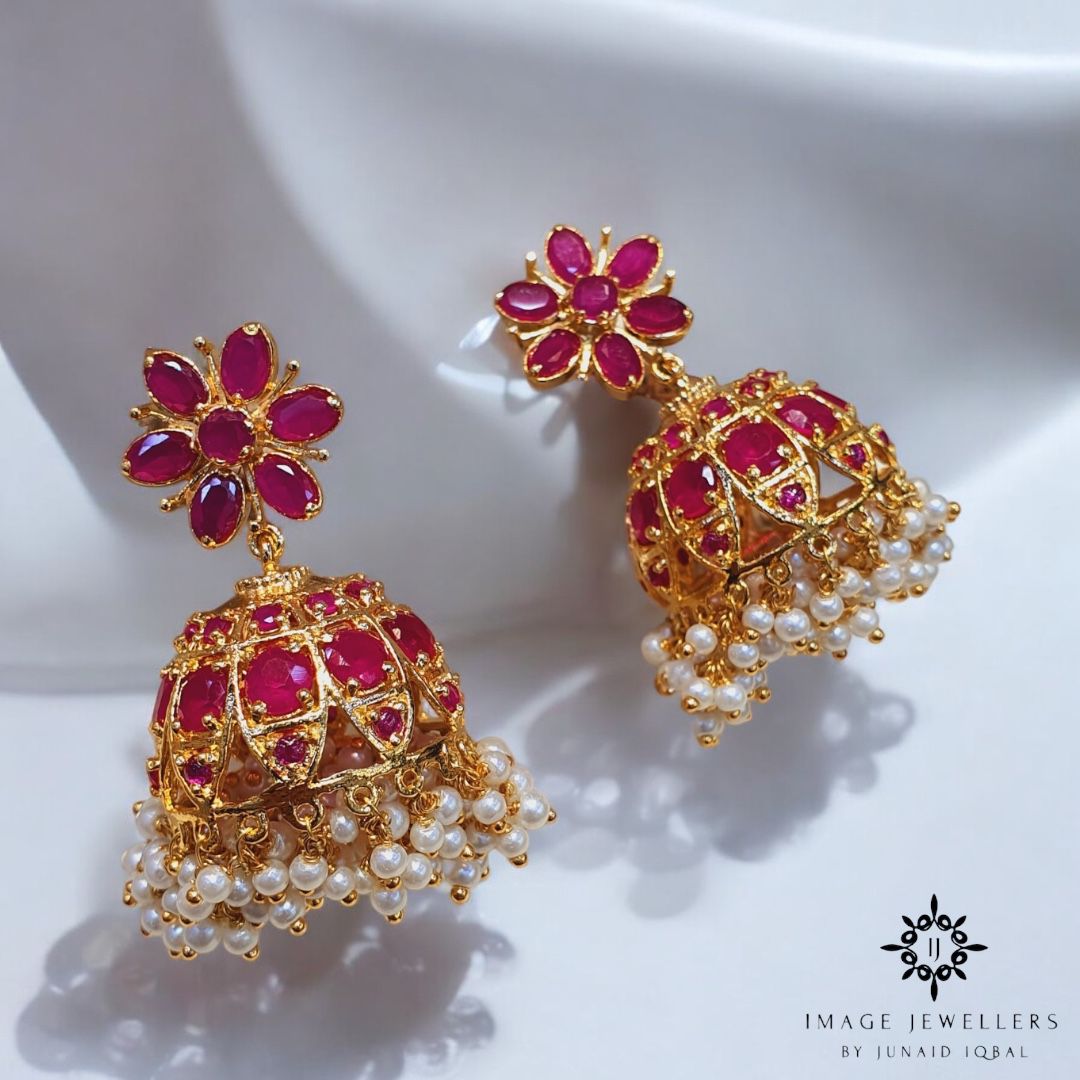 ✨ When antique rubies meet modern elegance ✨ These 22kt gold-plated jhumkas, crafted from 92.5 pure silver, are the ultimate flex. Finished with a cascade of pearl tassels and dripping in luxe, they’re perfect for turning heads and owning the vibe. ✨💎