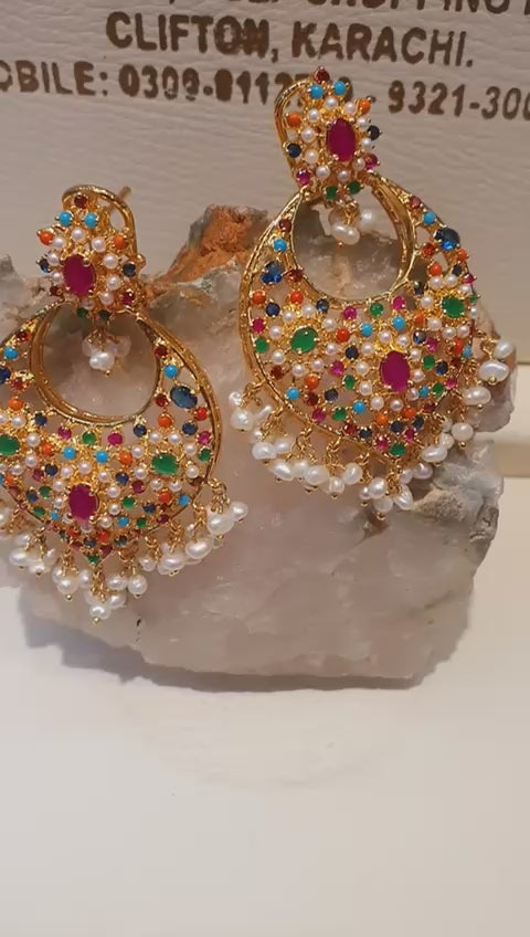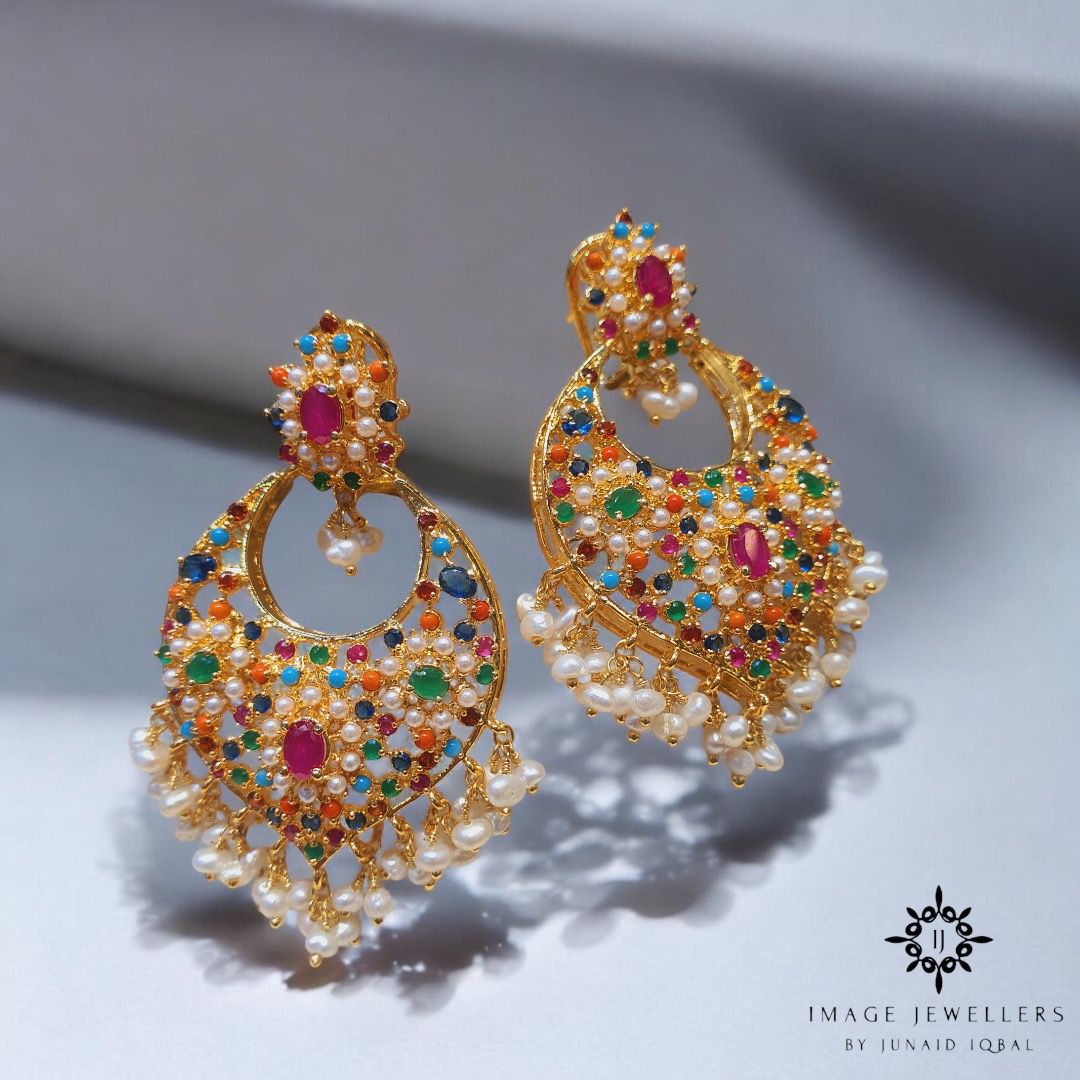 ✨ Elevate your vibe with our luxe earrings—crafted in 92.5 pure silver, dipped in 22kt gold, and dripping elegance with white pearl tassels and multicolor Nauratan stones. Because bold moves deserve iconic accessories! 💫
