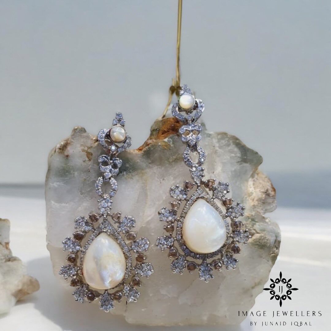 These elegant earrings feature luminous mother of pearl stones, enhanced by the sparkling brilliance of zircon accents. Set in a timeless design, the iridescent glow of the pearl perfectly contrasts with the shimmer of the zircon, creating a sophisticated and refined piece. Ideal for both casual and formal occasions, these earrings offer a harmonious blend of natural beauty and dazzling sparkle.