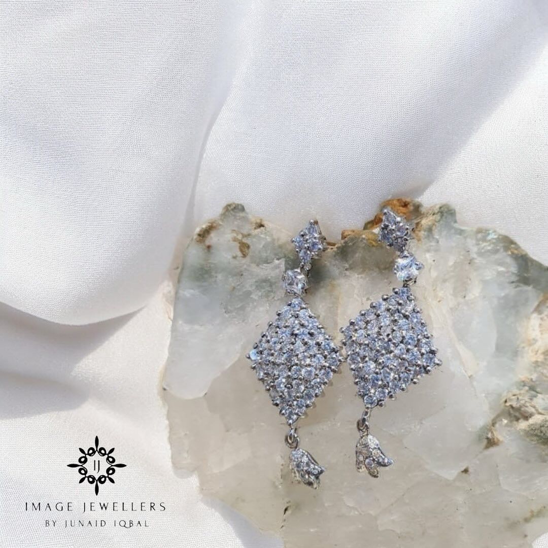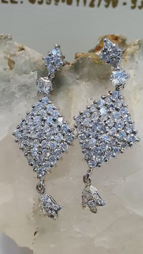 hese stunning earrings feature sparkling white stones adorned with brilliant zircon accents, all beautifully set in 22kt gold-plated 92.5 silver. The elegant combination of shimmering stones and gold plating creates a timeless piece that adds a touch of sophistication to any outfit, perfect for both day and evening wear.