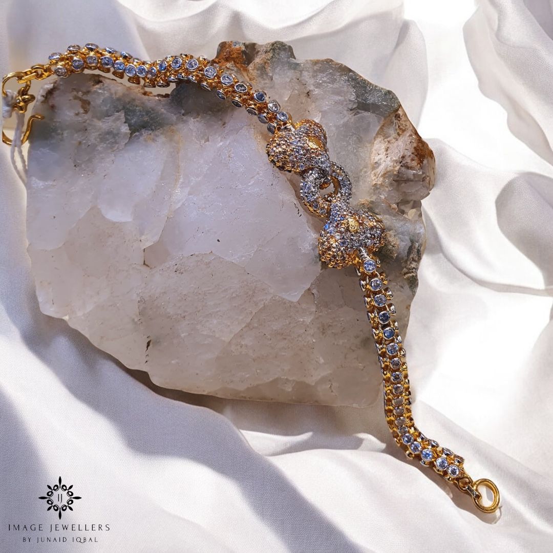 Crafted in 925 sterling silver and dipped in radiant 22kt gold, this bracelet is a symphony of fine artistry and sparkle. Adorned with shimmering diamonds and hand-set gemstones, it’s a piece that speaks without words.