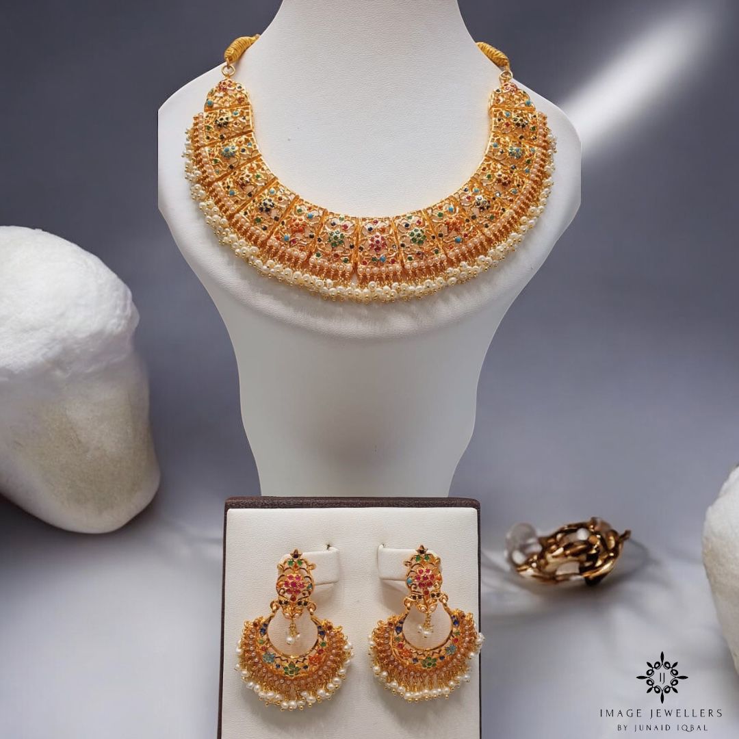 This Nauratan statement set is crafted in 925 silver with luxe 22kt gold plating, featuring a bold necklace, sparkling jhumkas, and a perfectly finished tikka. From party nights to bridal moments, this set is made to turn heads and steal the spotlight 💛