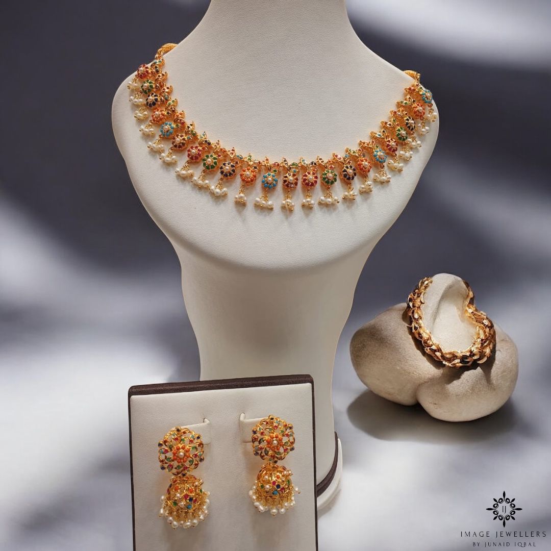 This Nauratan statement set is crafted in Silver 925 with 22KT gold plating, featuring a bold necklace paired with sparkling jhumkas that instantly elevate your look.