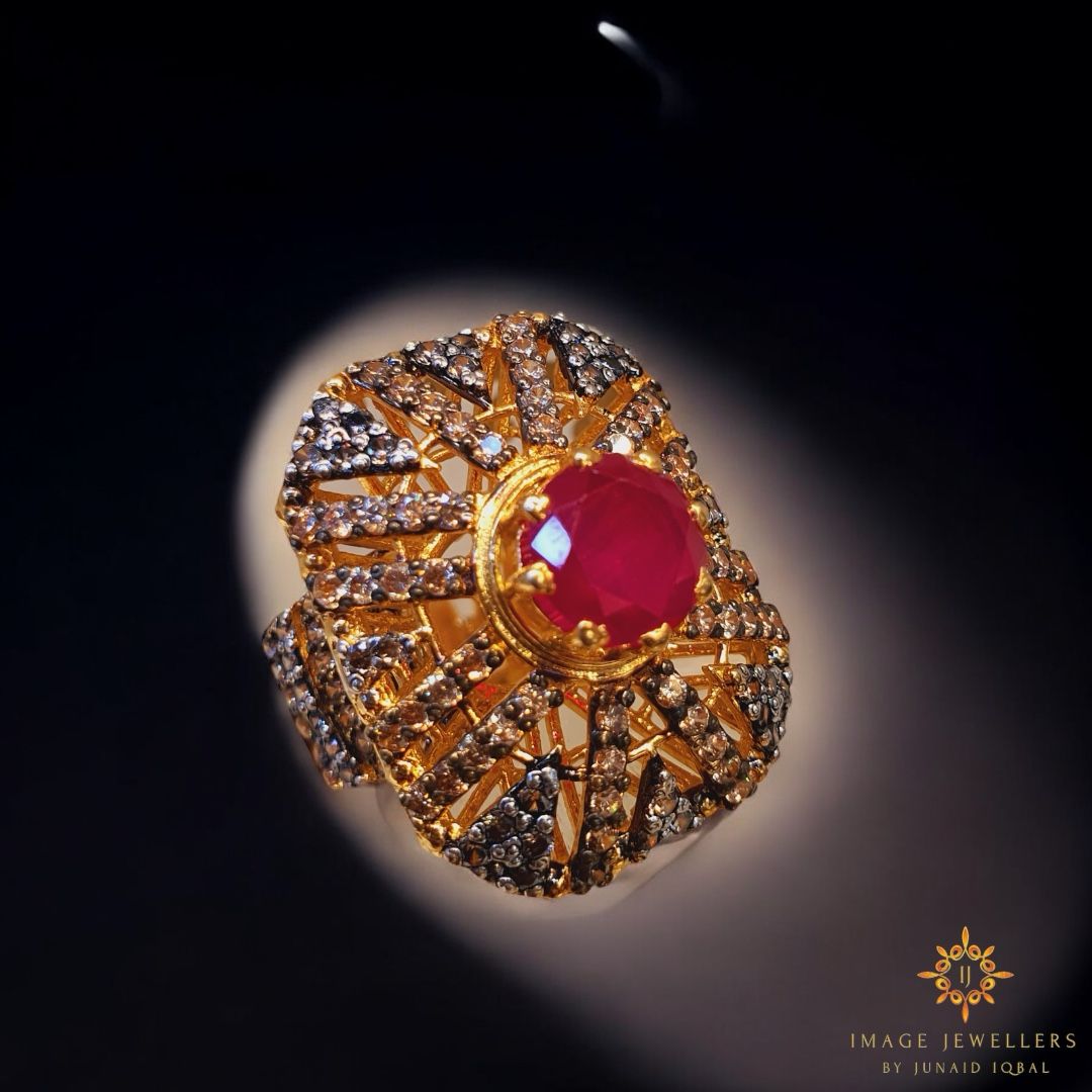 Golden glow, silver strength, and a ruby that steals the show! ✨ This 22kt gold-plated 925 silver masterpiece is all about luxury with a lifetime shine guarantee. Uniquely crafted, detailed with sparkling diamonds, and polished to perfection—because your style deserves nothing less! ❤️💎